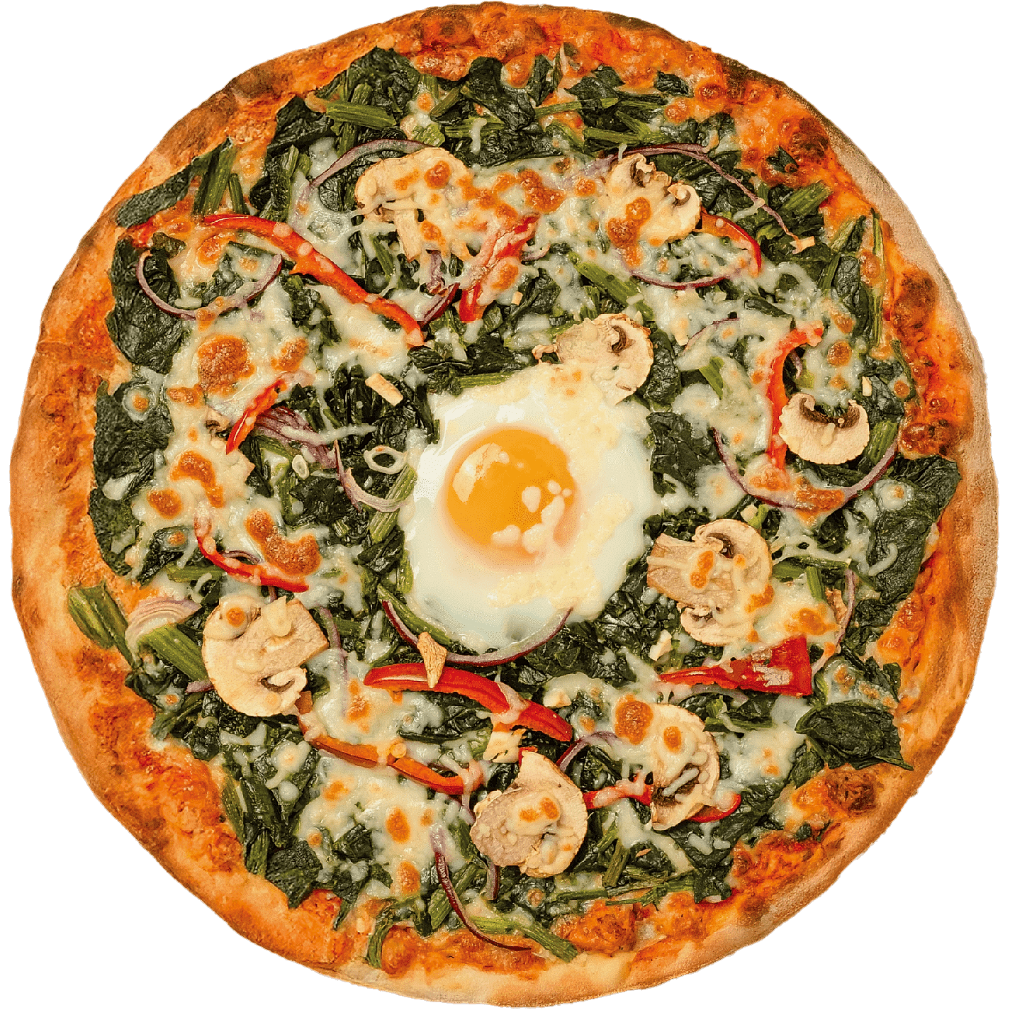 Ingredients; Mozzarella Cheese, Pizza Sauce, Spinach, Mushroom, Pepper, Egg, Onion.
