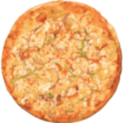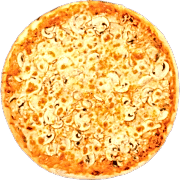 Ingredients; Mozzarella Cheese, Pizza Sauce, Mushrooms, Chicken Cubes, Peppers, Corn, Onions.