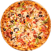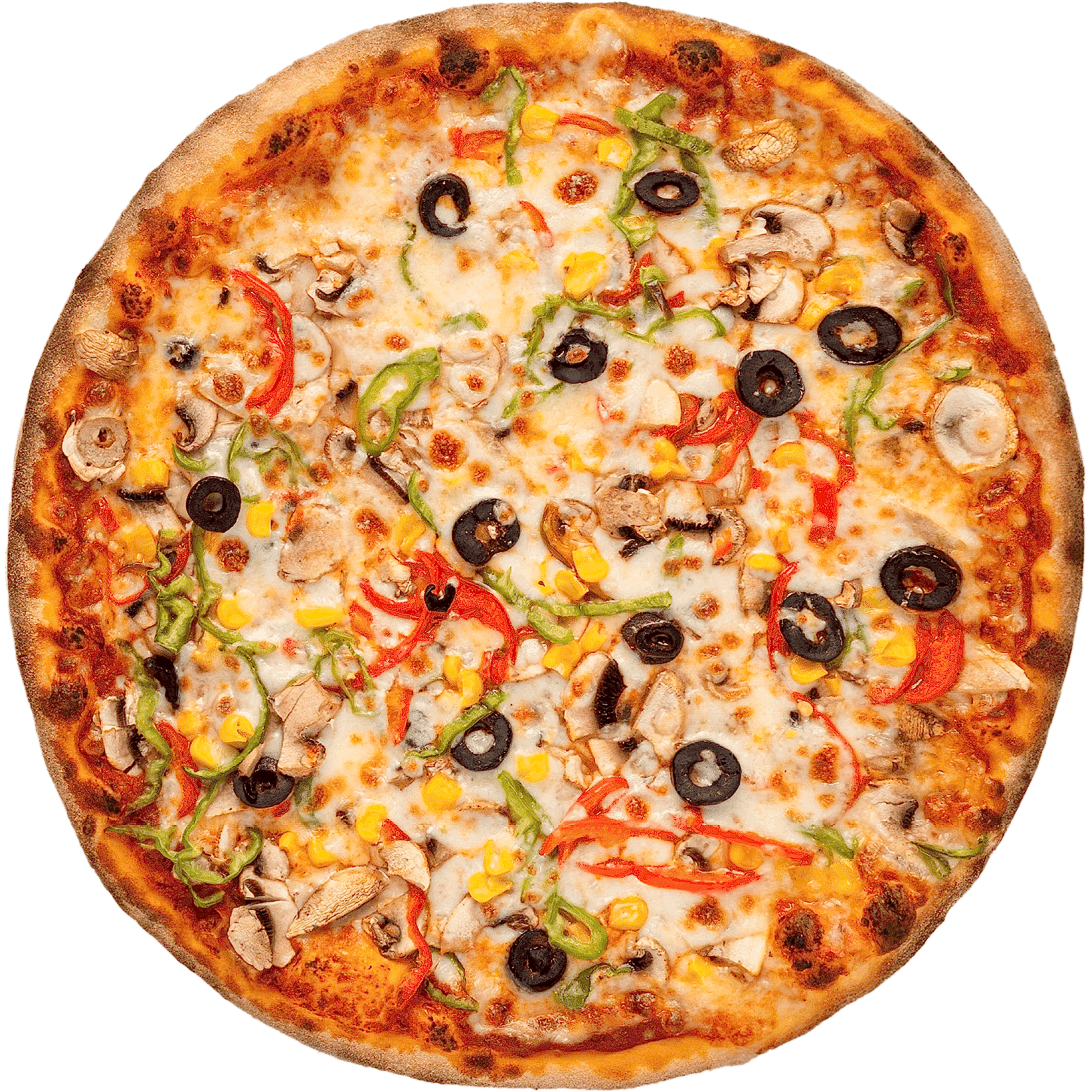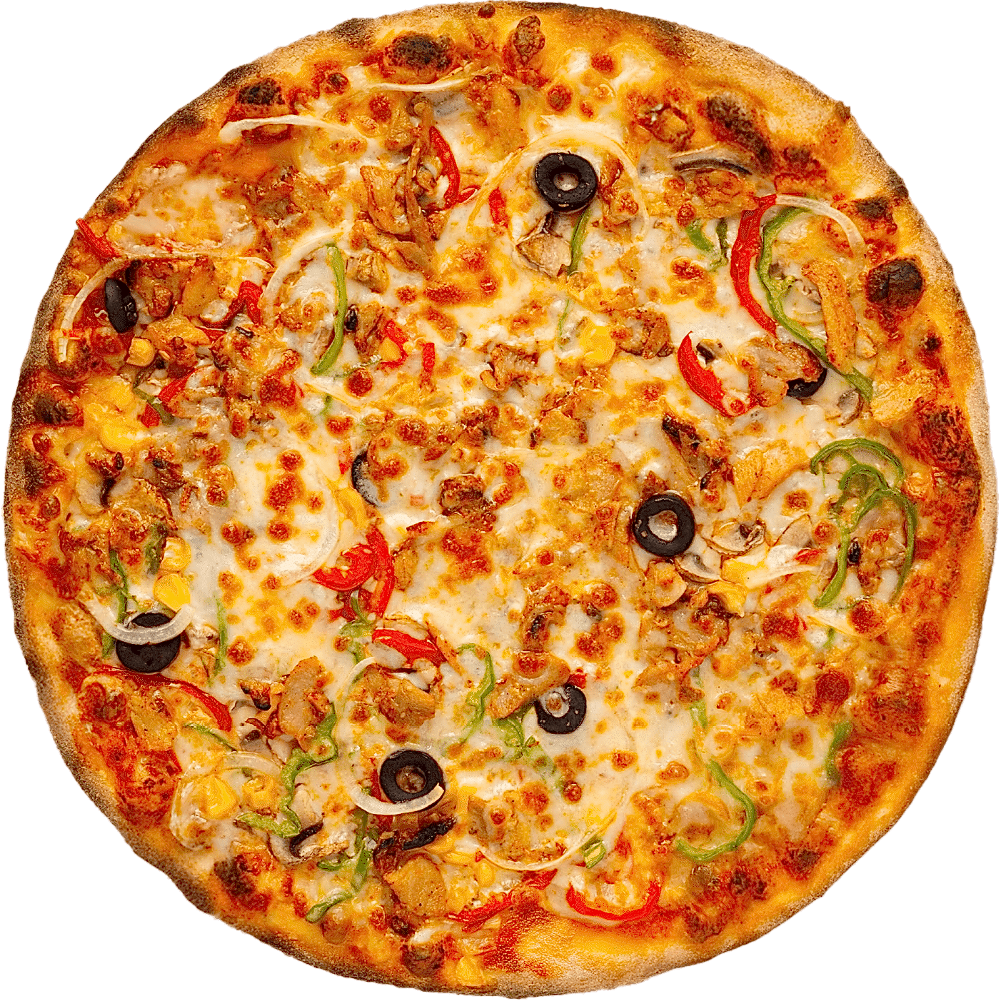 Сыр моцарелла, соус для пиццы, курица донер, грибы, перец, кукуруза, оливки, лук