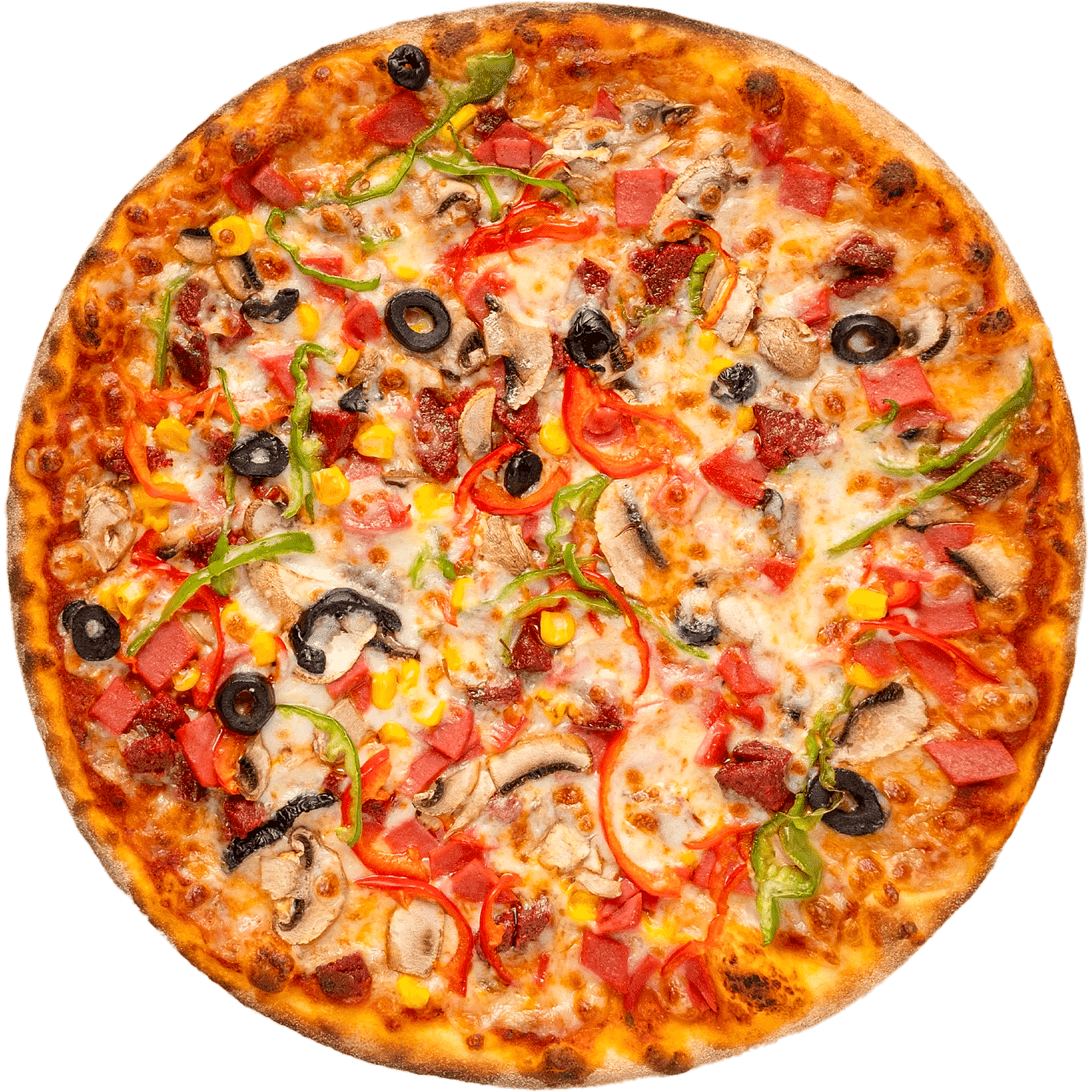 Сыр моцарелла, соус для пиццы, бекон, салями, колбаса, грибы, перец, оливки, кукуруза