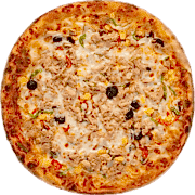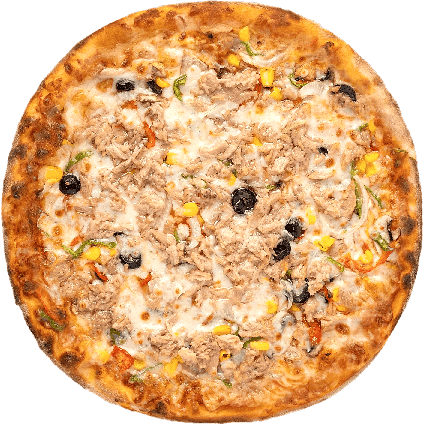 Сыр моцарелла, соус для пиццы, тунец, грибы, перец, оливки, кукуруза, лук