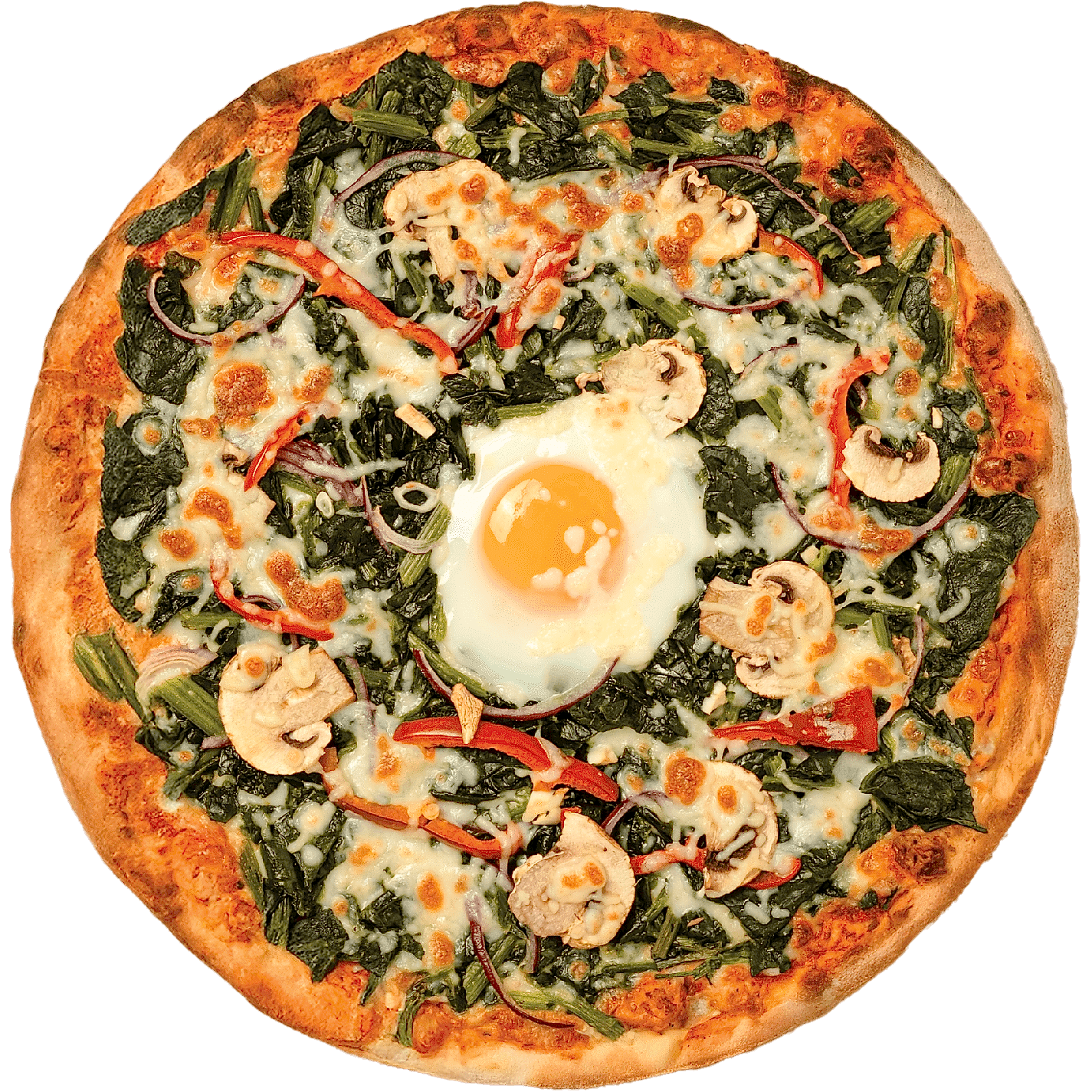 Содержание; Сыр Моцарелла, Соус для Пиццы, Шпинат, Грибы, Перец, Яйцо, Лук.