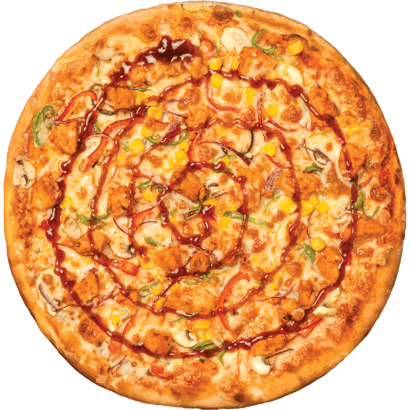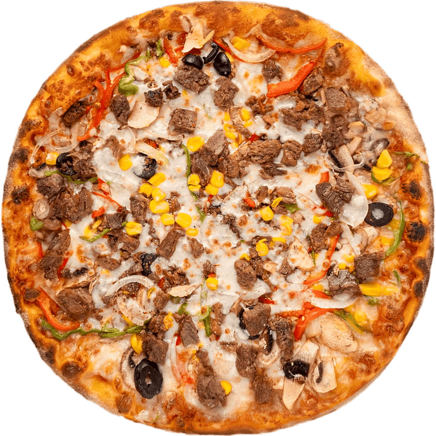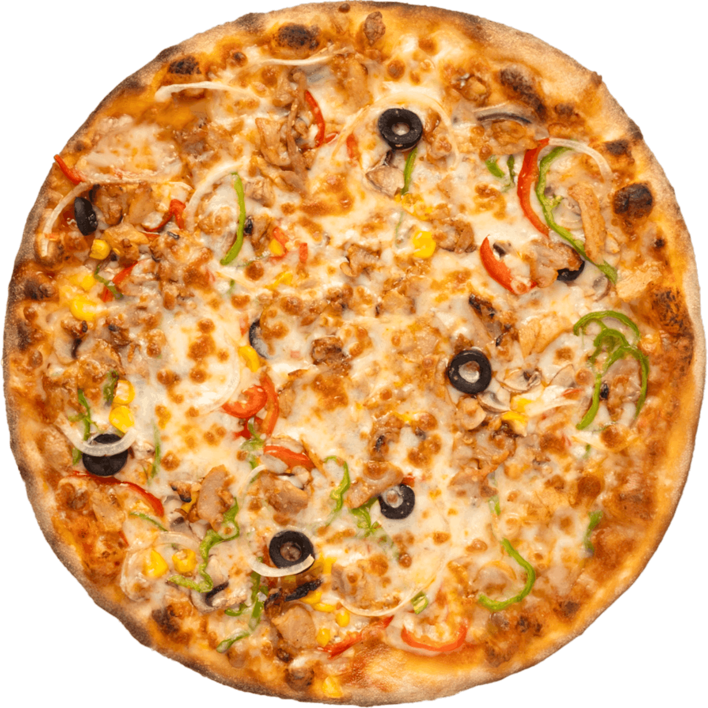 Azerbaycan'da tercih edebileceğiniz zengin malzemeli bir pizza: Mozzarella peyniri, tavuk, mantar, biber, mısır ve soğan.